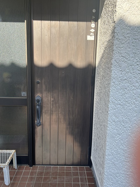 色褪せて表面のシートが剥がれてきたゲンカンドア表面にダイノックシートを施工しました。通常のシートより表面が強い外部用のシートを選択しております。メーカーの記述では耐久性10年となってます。